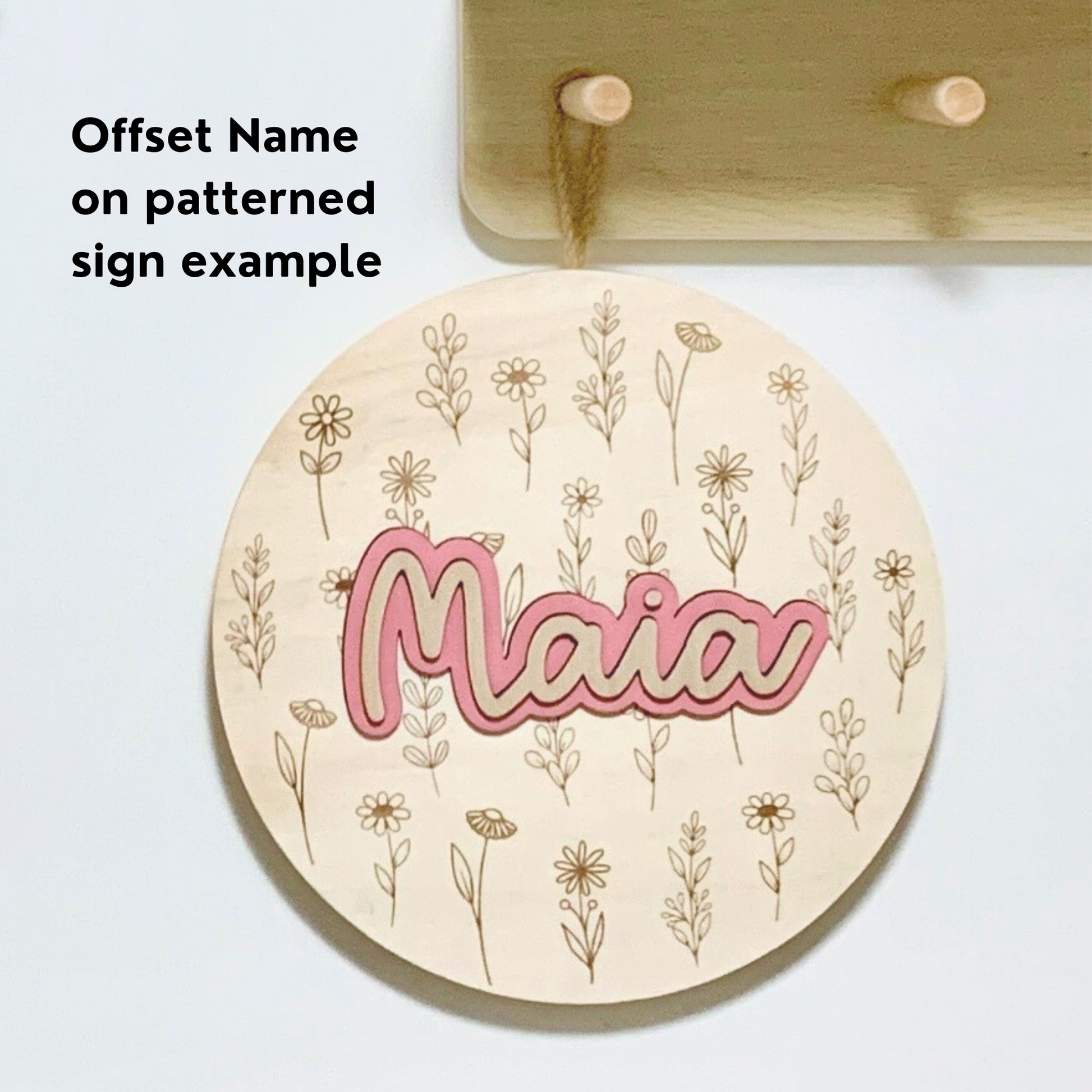 The circular wooden plaque is 28cm diameter with engraved background design. Choose from standard laser cut name or offset laser cut name (coloured background) on top.